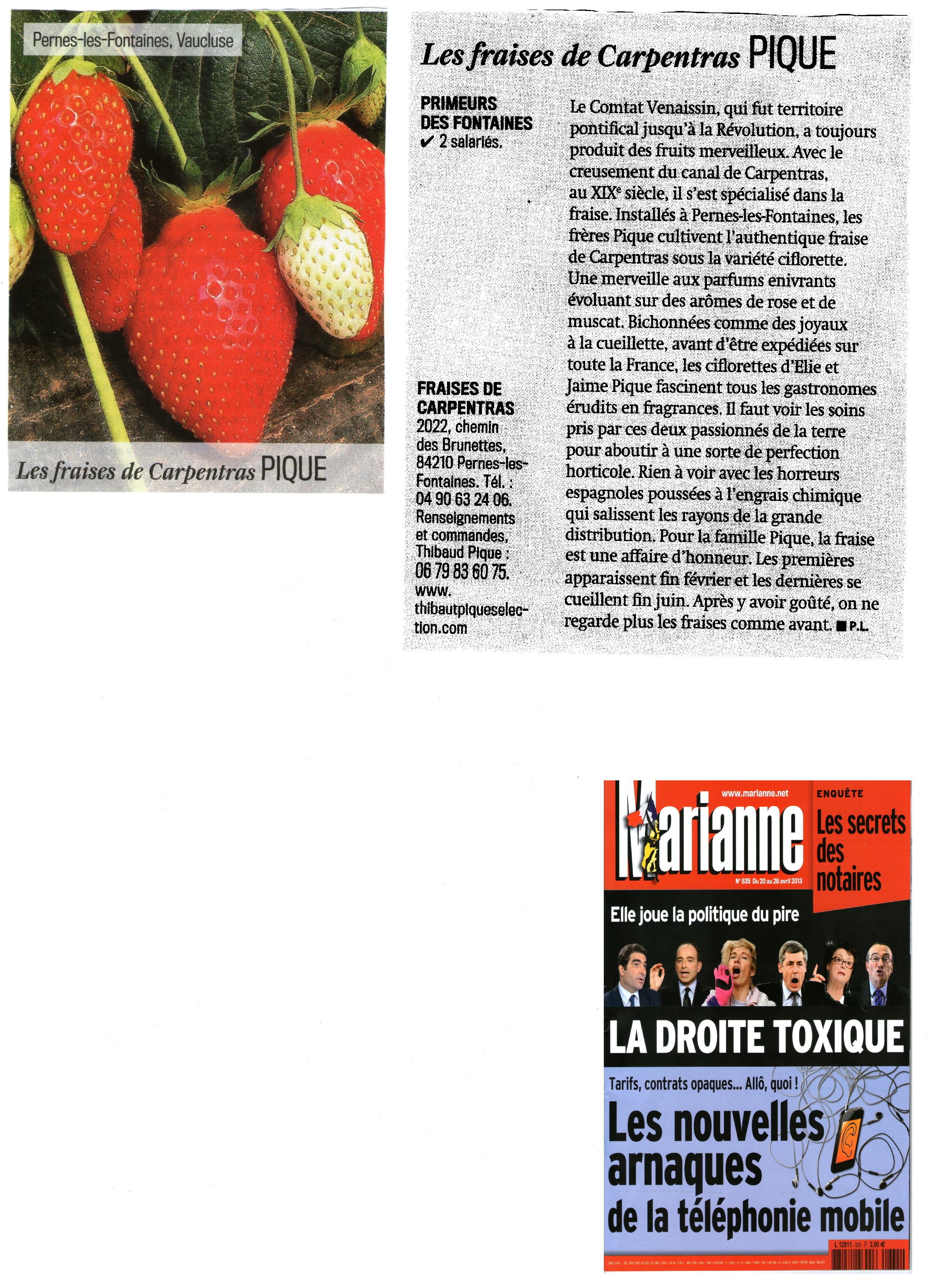 Je m’occupe de la distribution de la fraise ciflorette vers les grands hôtels et restaurants de Paris. La Ciflorette fait parler d’elle dans le Marianne de cette semaine sur les chroniques gastronomiques de Perico Légasse. Voyez plutôt la belle éloge de ce produit dont nous sommes très fiers. (cliquez sur la photo pour agrandir l’article)
